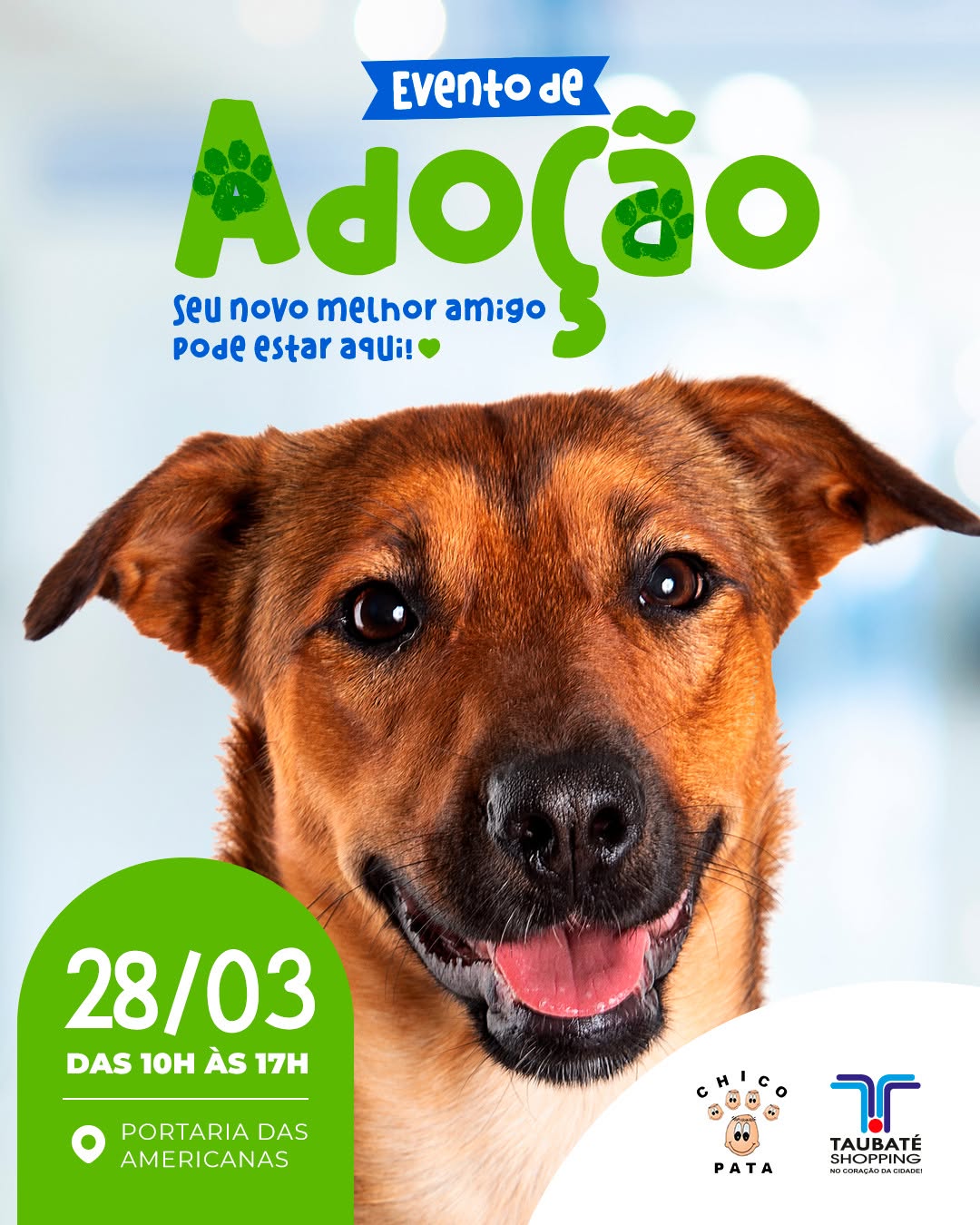 O Taubaté Shopping promove neste sábado (28) mais uma feira de adoção de cães e gatos em parceria com a ONG Chico Patas. A ação acontece das 10h às 17h e incentiva a adoção responsável e o cuidado com os animais.